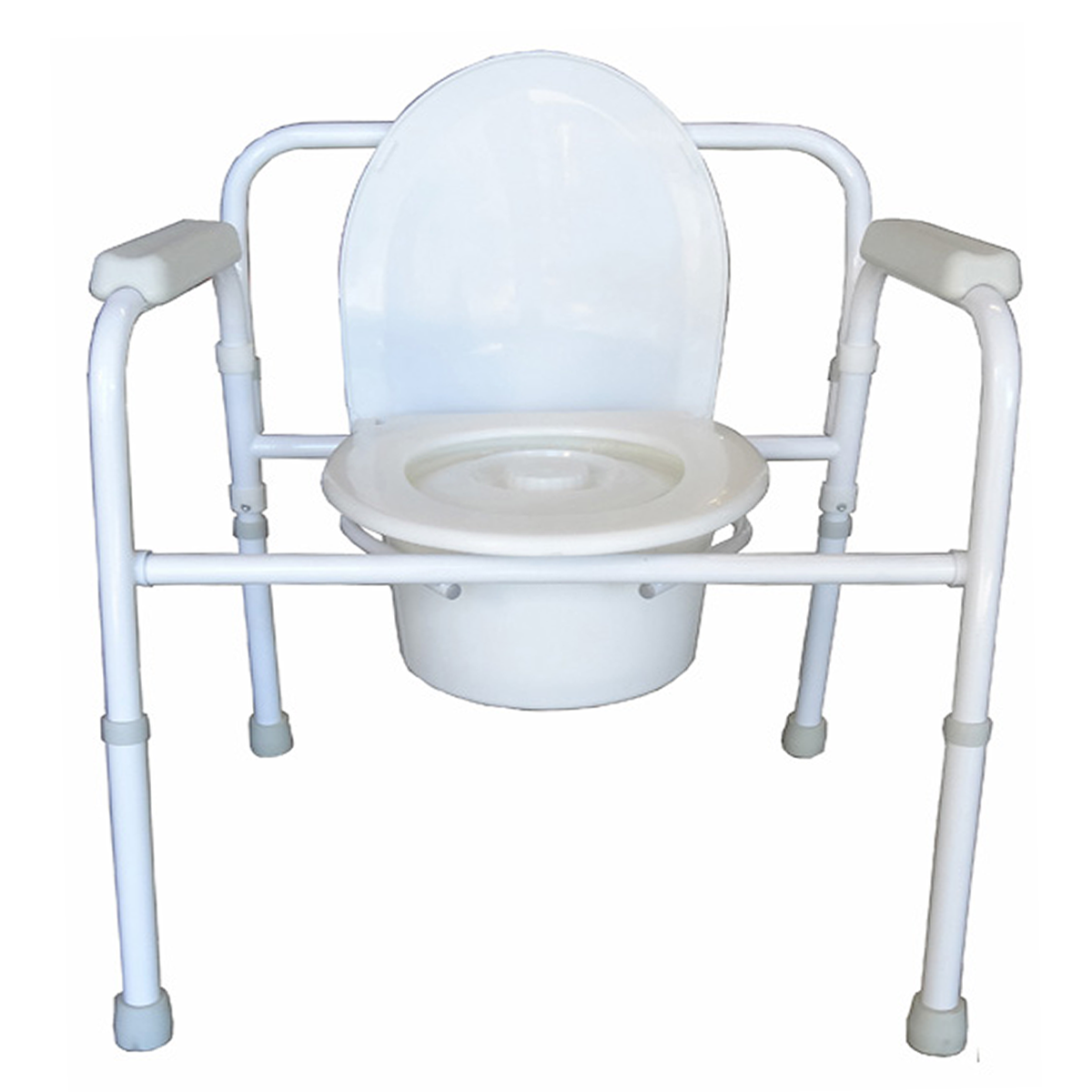 The BeMed 3 In 1 Commode With Pail Foldable can be used as a bedside commode, a toilet riser, and a toilet safety frame. Adjustable seat height. Non slip rubber tips.