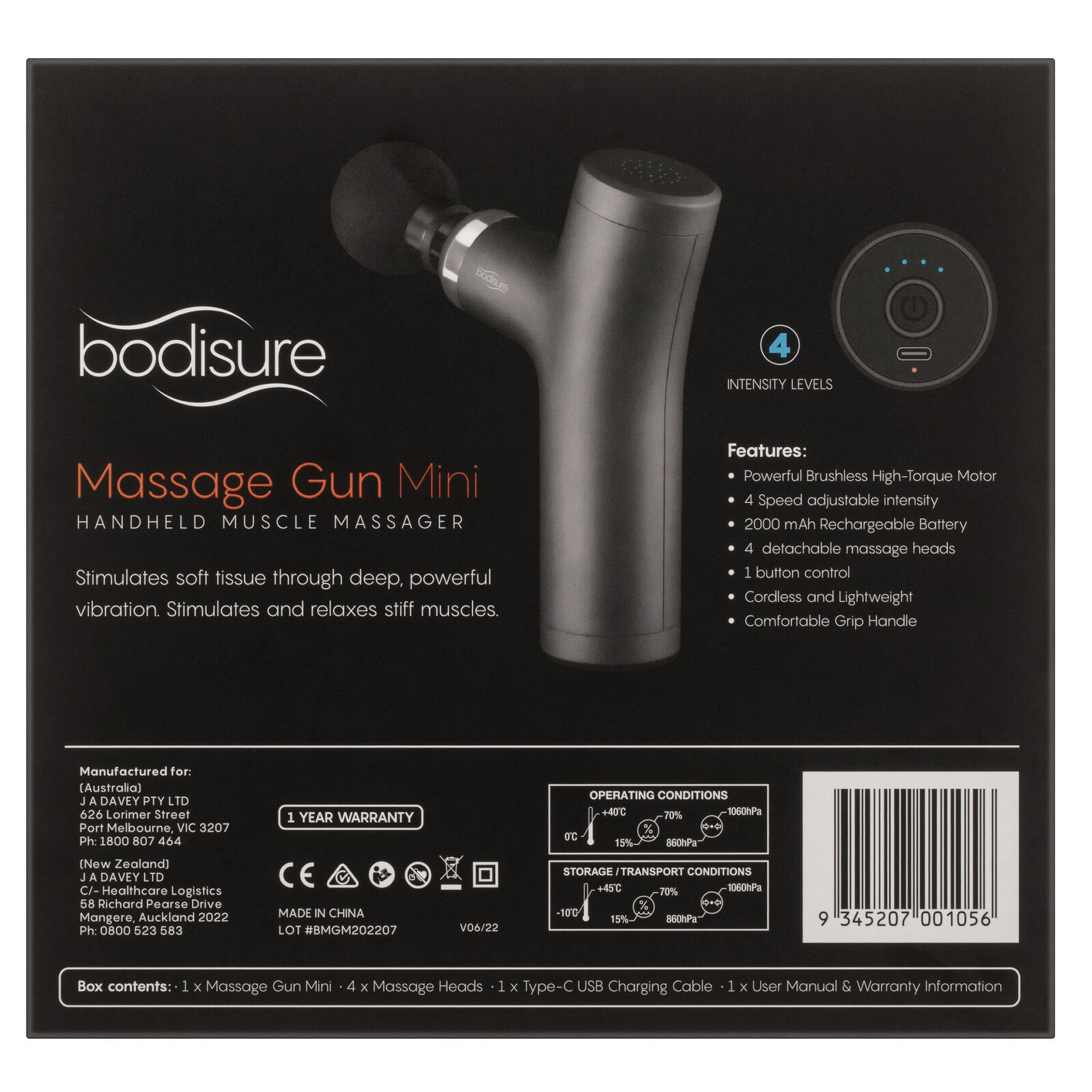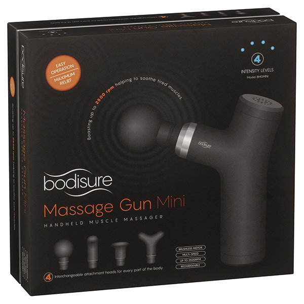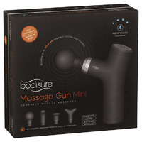 The BodiSure Massage Gun Mini is a powerful deep tissue handheld muscle massager, incorporating a 2500rpm brushless high torque motor and 4 interchangeable massage heads, which can be used to massage the soft tissue through deep and powerful vibration and relax stiff muscle groups in multiple areas of the body.