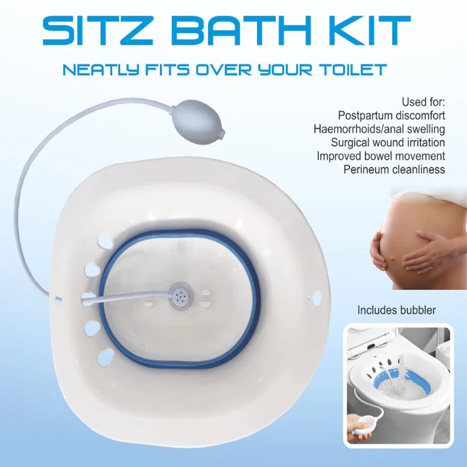 Enjoy a warm, shallow bath to sit in and cleanse your anal and genital area. A Sitz bath Kit can often relieve pain and discomfort from conditions such as hemorrhoids, anal fissures, perineal pain, and itching. Commonly prescribed as a simple and easy way to cleanse the perineum. The perineum is the space between your rectum and vulva or scrotum. By sitting in warm water you increase blood flow in the region and assist in promoting healing, cleanse, and relieve pain, itching, and irritation around the genitals.