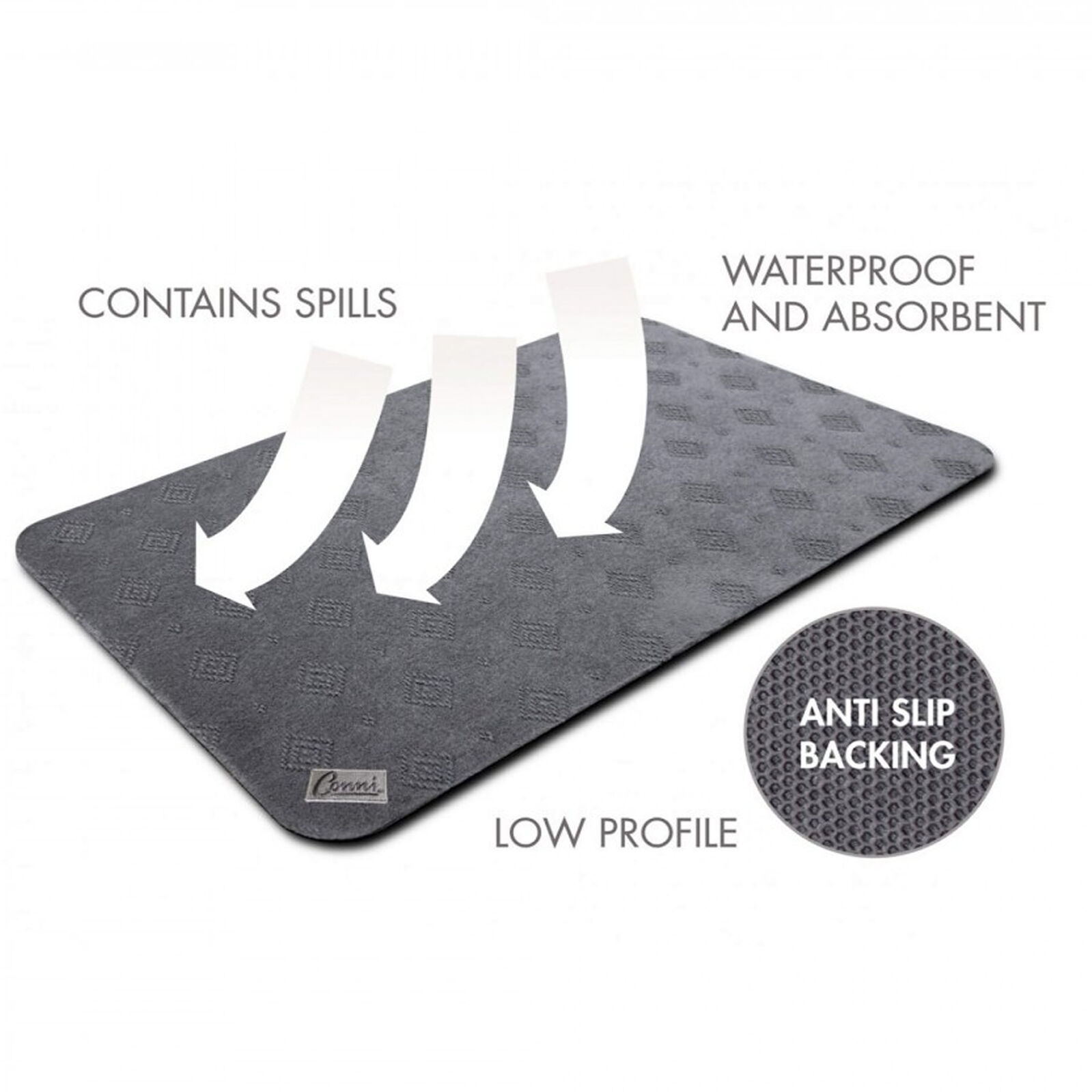 The Conni Floor Mat is an absorbent, firm, non-slip mat for use on hard floors or carpets. It is ideal for use in any areas where liquids are frequently spilt, such as in next to the toilet, basin or shower in bathrooms or next to the sink in kitchens. It can also be used next to the bed or chair, or under commodes and IV stands in case of spills.