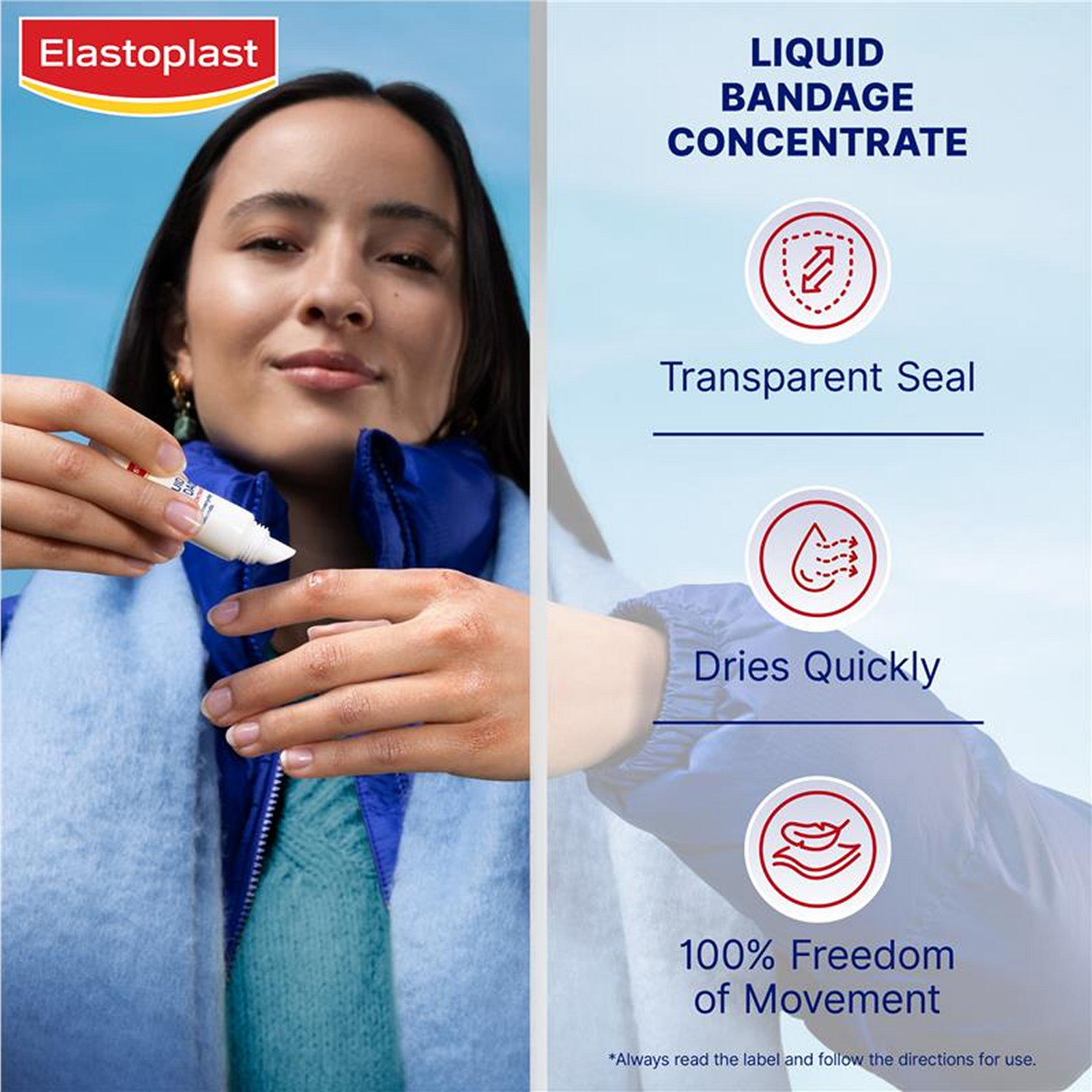 Elastoplast Second Skin Protection Liquid Bandage Concentrate - Feels like a second skin Elastoplast Second Skin Protection Liquid Bandage Concentrate for precise covering and protection of minor, superficial, dry everyday wounds such as scratches, cuts and grazes. Also suitable for cracked skin. Upon application, the product dries quickly to form an invisible, flexible and ultra-thin film to cover and protect the wound from dirt and water. The slanted applicator provides an easy and precise application that is convenient to use. The formula is water resistant and creates a transparent seal that allows freedom of movement and feels like a second skin. Size: 10ml 60 Applications