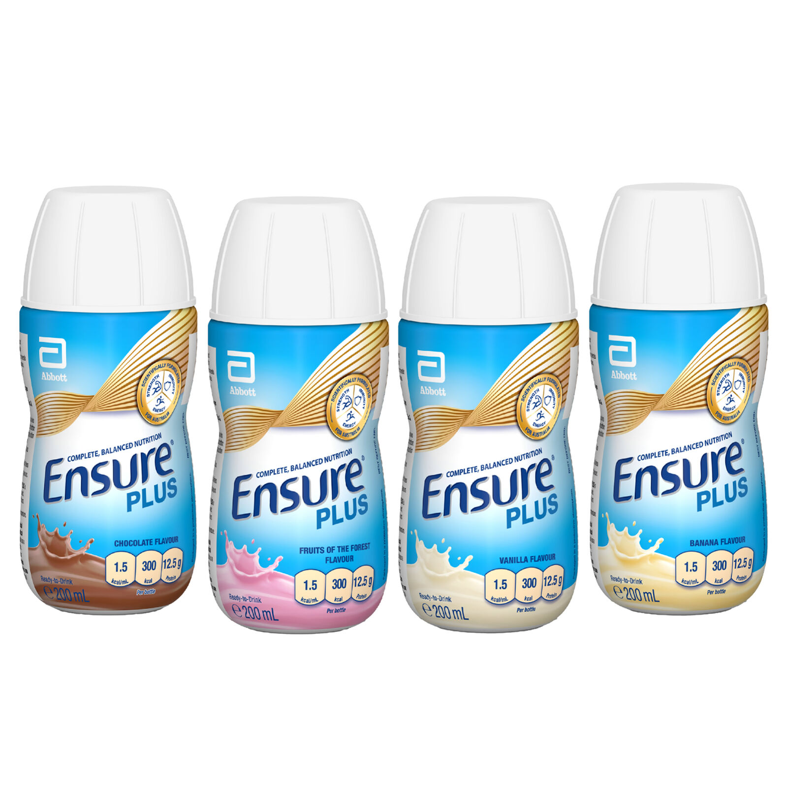 Ensure Plus is ready-to-drink, and is available in Chocolate, Vanilla, Banana, or Friuts of the Forest flavours. It is presented in a 200mL easy to open bottle with a twist cap which will be convenient for travel or on-the-go as well as tube feeding.