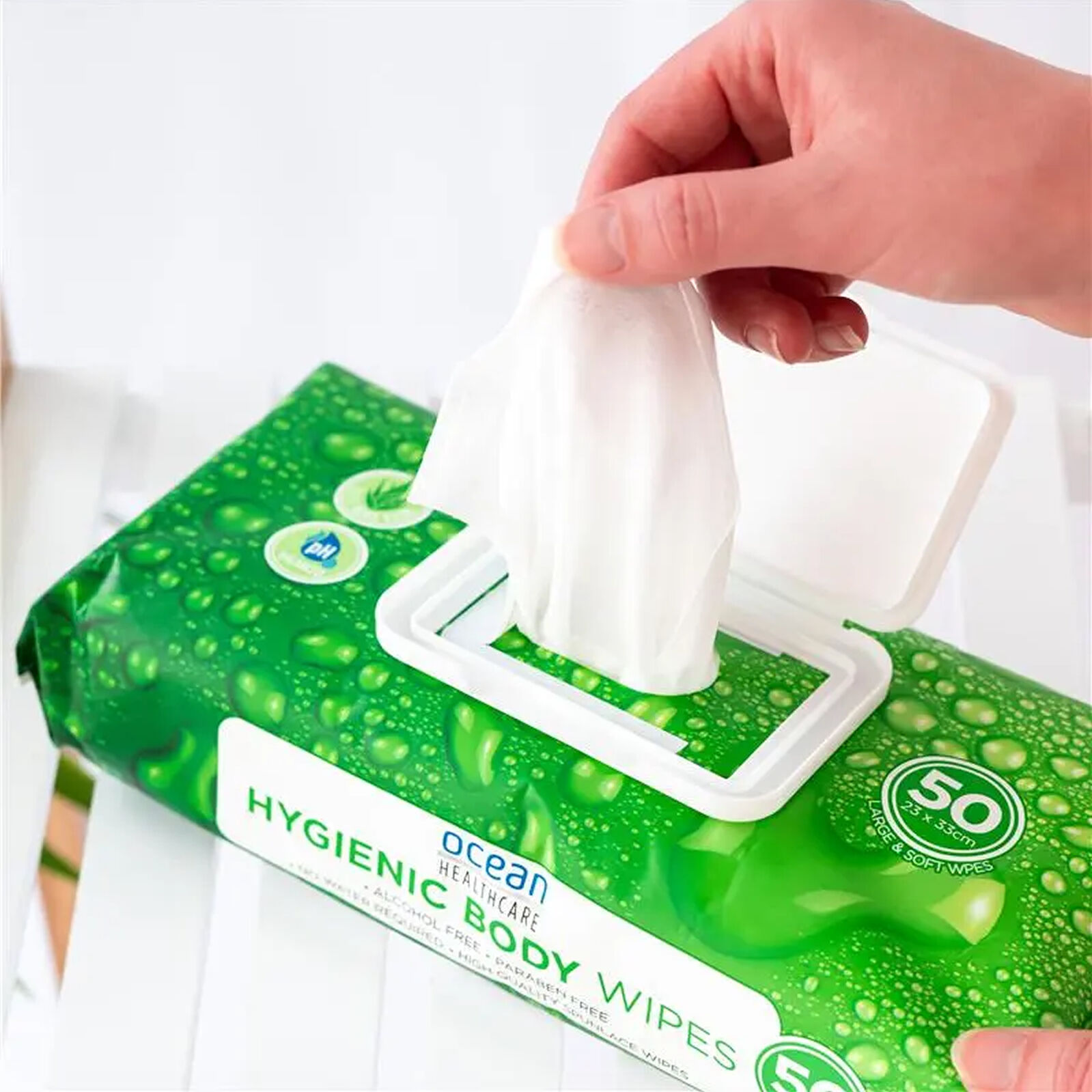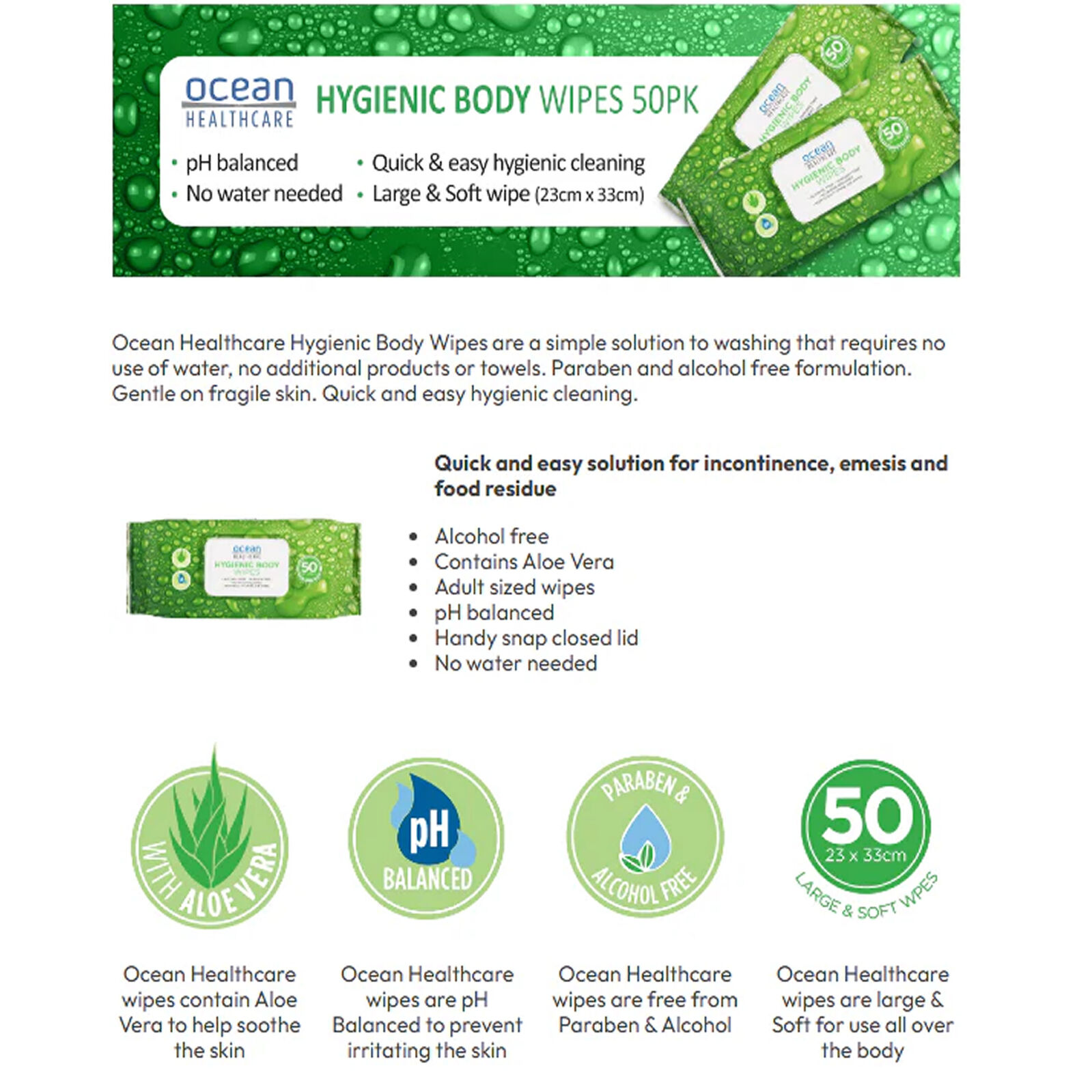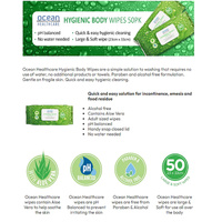 Ocean Healthcare Hygienic Body Wipes are a simple solution to washing that requires no use of water, no additional products or towels. Paraben and alcohol free formulation. Gentle on fragile skin. Quick and easy hygienic cleaning