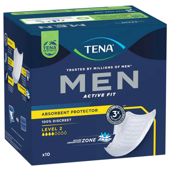 TENA MEN Active Fit Absorbent Protector Level 2 offers discreet, secure protection against medium bladder leakage.