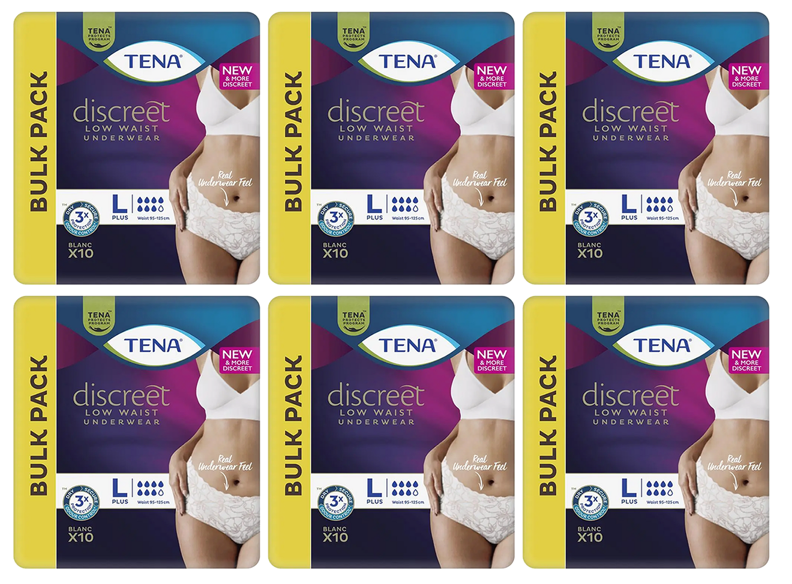 TENA Women’s Discreet Low Waist Blanc incontinence underwear have a stylish low waist design with micro-stretch fabric that make them look and feel just like regular underwear.