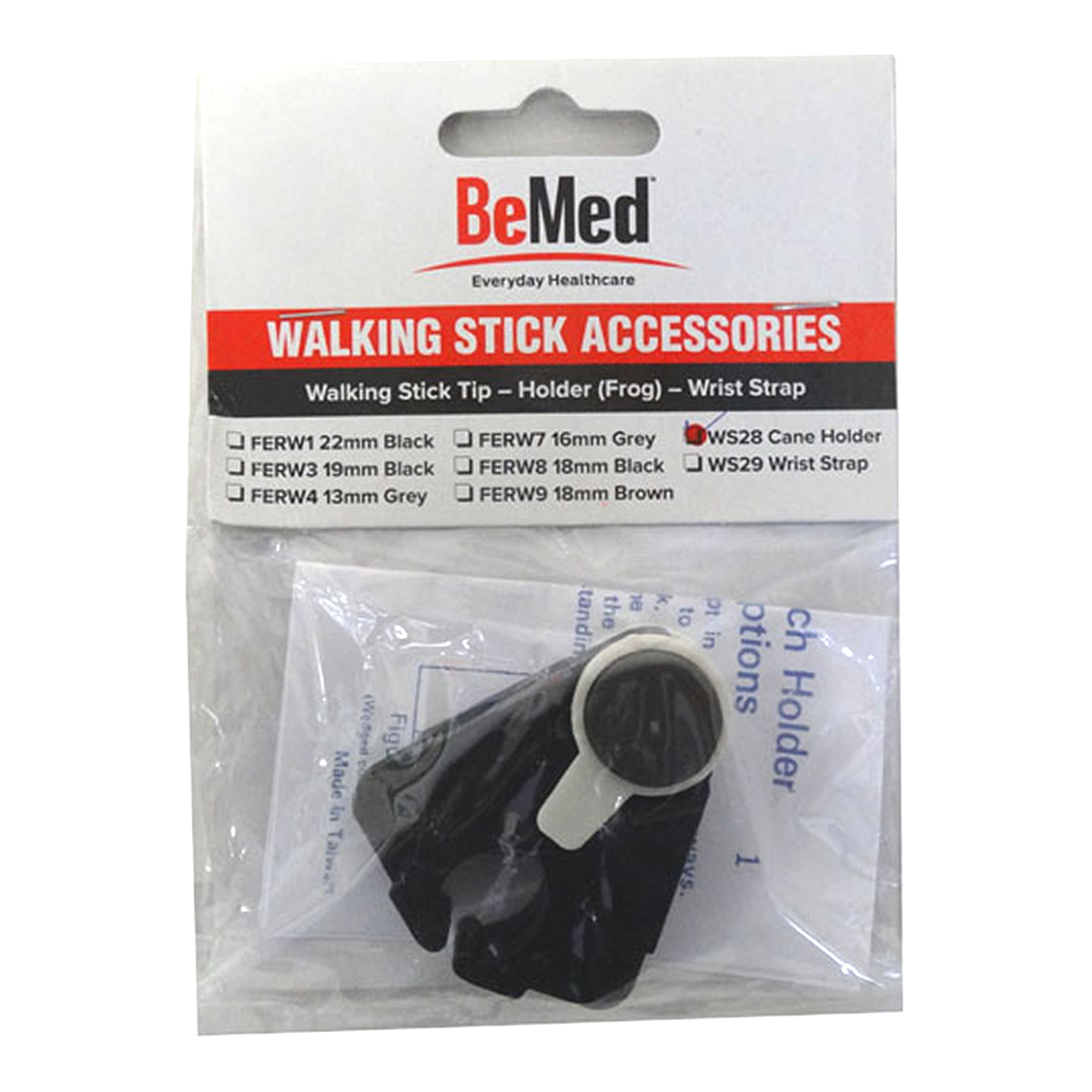The Frog Walking Stick Holder has a spring loaded plastic holder that clamps onto the walking stick.